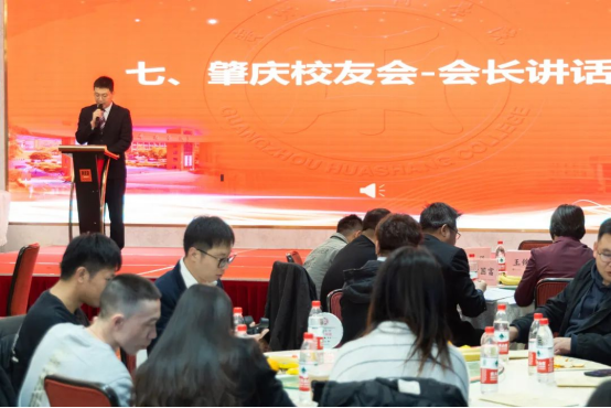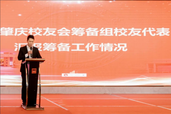 华商肇庆校友会筹备组代表程冠伦向大会汇报了大会筹备工作情况。他向大家讲述了筹备校友会一年来的历程和惊喜,通过点滴故事让大家深刻体会到校友之间的情谊与情怀。