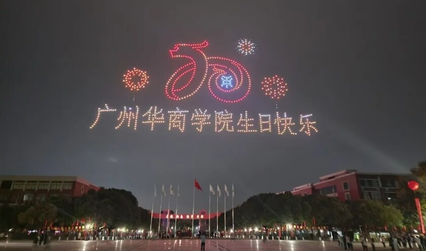夜幕降临,在广州校区中央图书馆操场上,1000架无人机在空中编队飞行,以《二十正青春 华商向未来》为主题,展现创校之光、立校之魂、育人之基、奋进之路、攀登之梯、美育之果、拥抱之姿、笃行之力、办学之魂等字样与图案,灯光在夜空中勾勒出母校的发展轨迹与美好愿景。当天,由华商师生自编自演的原创大型舞台音乐剧《华商正茂》正式首演。